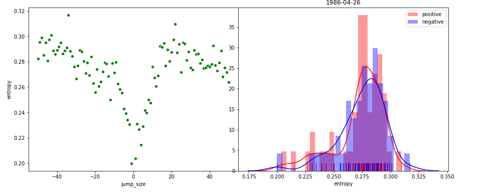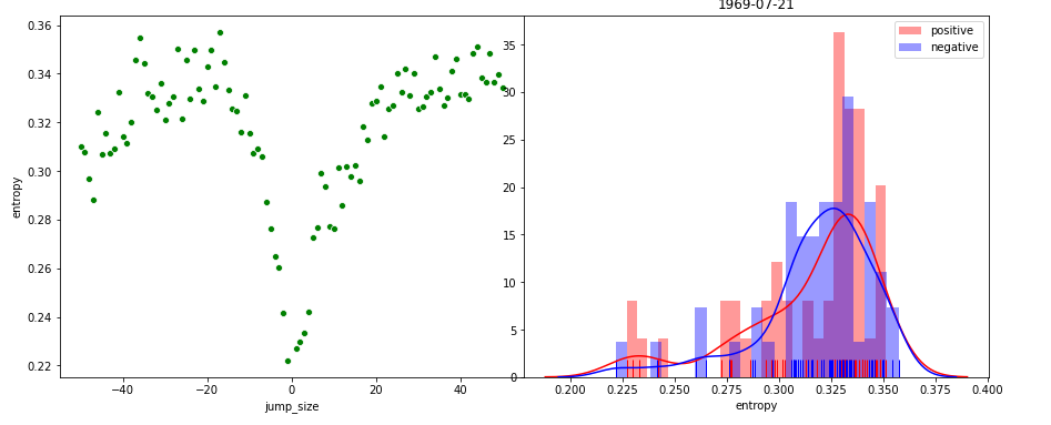 Here’s two examples. On the left of the plot, you see the difference expressed in entropy in newspapers on a set date compare to x dates in the past (negative jump size) or future (positive jump size). Dates close to the events are quite similar, and then the news reverts back to other stuff.